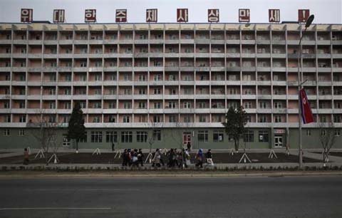 Nữ sinh Bình Nhưỡng rời khỏi quảng trường sau lễ khánh thành.