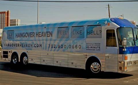 Được chuyến, xe buýt Hangover Heaven chạy từ 8 giờ sáng tới 3 giờ chiều mỗi ngày. Khi đã lên xe, bạn sẽ có hai gói lựa chọn: Mua chuộc (130 USD)-bao gồm hydrat hóa tĩnh mạch hoặc Cứu tế (200 USD)-bao gồm hydrat hóa tĩnh mạch, dùng thuốc chống buồn nôn và chống viêm đã được chứng minh để chữa trị hiệu ứng nôn nao, và bổ sung vitamin.