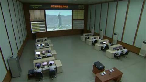 Trên màn hình lớn trong trung tâm chỉ huy là hình tên lửa đang được bơm nhiên liệu. Các nhà báo được biết là vệ tinh Unha-3 (Ngân Hà) đã được lắp lên đó.