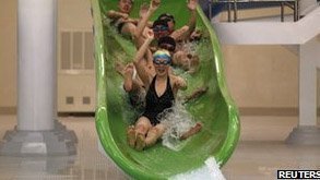 Mọi người đều có vẻ rất vui, trượt từ các máng nước xuống bể lớn, hoặc tận hưởng cảm giác thư thái, mát-xa từ các tia nước bắn ra. Thậm chí, ở đây còn có các bậc thang bằng kính để đi lên lầu.