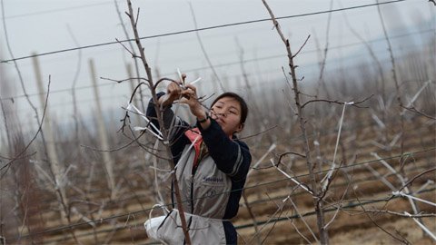 Một phụ nữ đang buộc các nhánh cây táo trong một trang trại gần Bình Nhưỡng