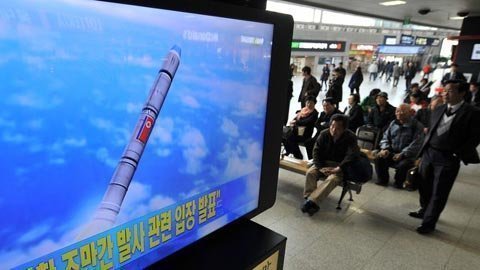 | Hình ảnh vụ phóng tên lửa trên truyền hình Hàn Quốc hôm 13/4. (Ảnh: Getty) |
