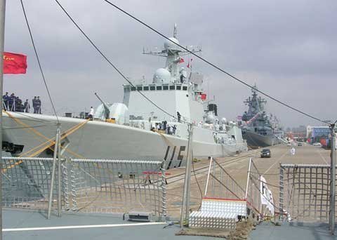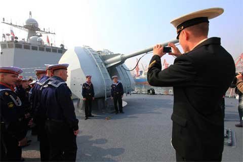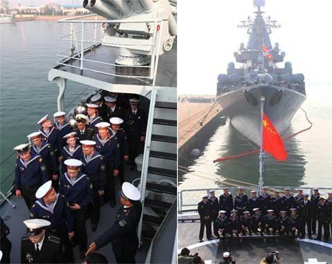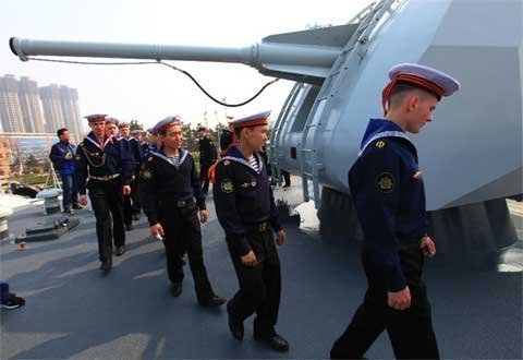 Binh sĩ trên tàu Varyag thuộc hạm đội Thái Bình Dương của Nga sang thăm tàu khu trục có trang bị tên lửa Shenyang của quân đội giải phóng nhân dân Trung Quốc.