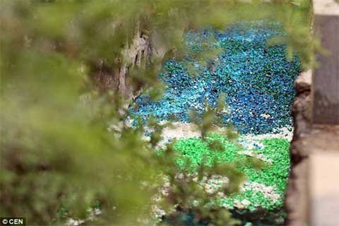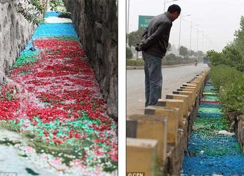 Cảnh tượng kỳ dị xảy ra dọc đường Zhengshang ở Zhengzhou, với gần 300m cống rãnh đã biến thành cầu vồng rực rỡ nhờ hàng núi viên thuốc màu xanh lá cây và xanh nước biển lấp đầy cống.