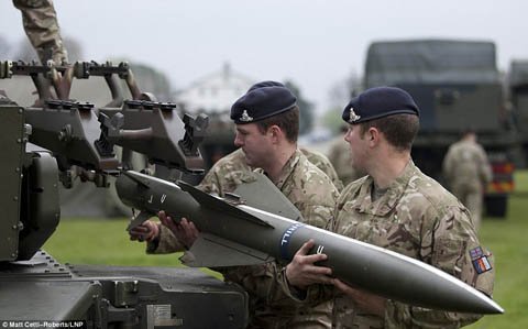 Những pháo thủ tới từ Trung đoàn pháo binh Hoàng gia 16 lắp một tên lửa thực hành vào hệ thống phòng không Rapier, đóng tại Blackheath, tây nam London.