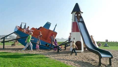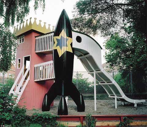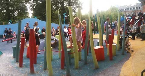 Thoạt nhìn, những món đồ màu sắc sặc sỡ ở sân chơi giống như nó vừa thoát ra từ những trang sách của Dr.Seuss. Song, những món đồ chơi tuyệt vời này là con đẻ của nhà thiết kế sân chơi người Đan Mạch Ole B. Nielsen và Christian Jensen.
