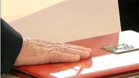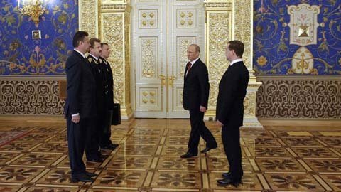 Sau khi đồng hồ tại Quảng trường Đỏ điểm đúng 12 giờ, Tổng thống mãn nhiệm Medevedev chào đón tân Tổng thống. Tân Tổng thống tuyên thệ nhậm chức