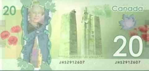 Trên tờ tiền còn một hình ảnh khác cho thấy đài tưởng niệm Vimy Thế chiến I tại Pháp, vốn làm rạng danh hàng nghìn người Canada chiến đấu và hy sinh trong trận chiến, giúp đổi hướng chiến tranh. Tuy nhiên, nhiều người trong các nhóm tập trung nói, họ không biết gì về trận chiến đó và trông nó khá là hiện đại.