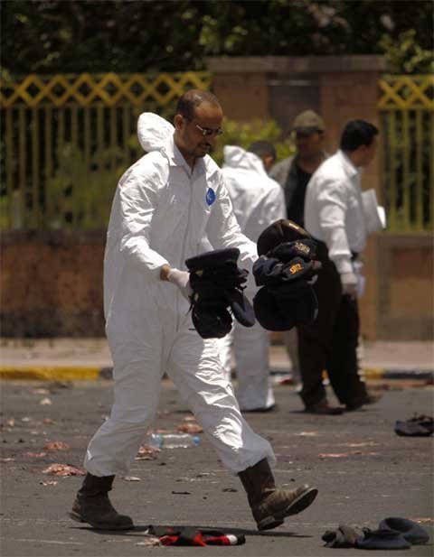 Vụ nổ khiến các bộ phận cơ thể nằm rải rác khắp đường tại quảng trường Sabaeen, nơi cách không xa dinh Tổng thống.
