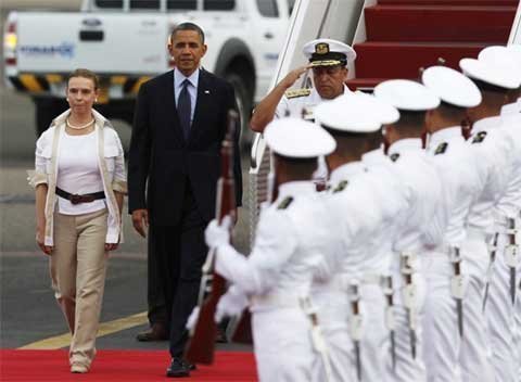 Tổng thống Mỹ Obama được thứ trưởng ngoại giao Colomiba Monica Lanzetta tháp tùng khi ông tới đây dự hội nghị thượng đỉnh Mỹ. Ảnh chụp ở sân bay Cartagena 13/4/2012.
