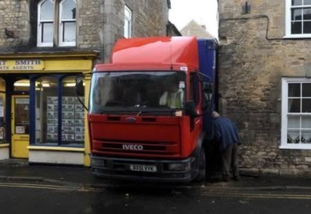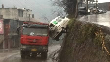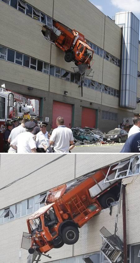 | Xe tải đâm thủng tường và nằm cheo leo ở tầng 3 tại một gara. |