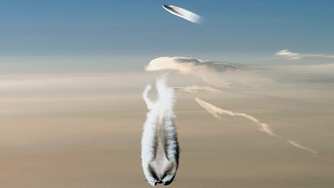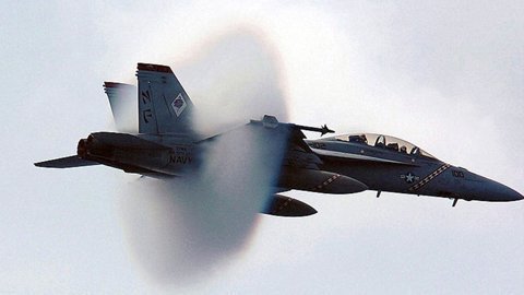 Máy bay chuển sang chế độ siêu thanh, tạo nên một cú nổ âm thanh. Hình ảnh này diễn ra chỉ trong khoảng thời gian chưa tới một giây, nên rất khó chụp |