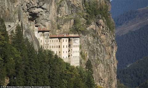 Các tu viện được xây dựng cheo leo bên vách đá không chỉ giới hạn ở châu Á. Thổ Nhĩ Kỳ cũng có một nơi tương tự, đó là tu viện Sumela, nằm trên độ cao 1.188m. Nó được xây dựng vào năm 386 công nguyên trong thời gian nắm quyền của Hoàng đế Theodosius I, sau khi hai tu sĩ phát hiện ra một biểu tượng huyền diệu của Đức mẹ đồng trinh Mary trên một hang đá ở núi.