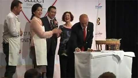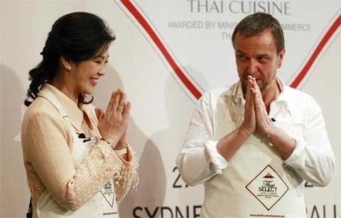 Nữ Thủ tướng Thái xinh đẹp mặc tạp dề bắt đầu chuyến thăm Australia dài 4 ngày bằng màn trình diễn nấu nướng tại tuần lễ thực phẩm Thái ở Sydney.