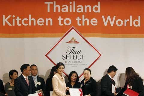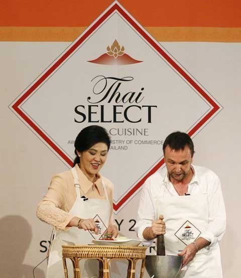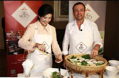 Trước một nhóm khách mời và quan chức, nữ Thủ tướng xinh đẹp của Thái đã cùng đầu bếp ngôi sao David Thomson chuẩn bị món salad đu đủ.
