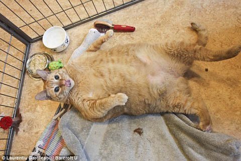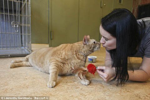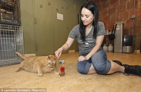 Chú mèo Sponge Bob tham ăn, có cân nặng tương đương một đứa trẻ 4 tuổi, đang trong chế độ ăn kiêng và tập thể dục nghiêm ngặt tại vườn thú Heaven.