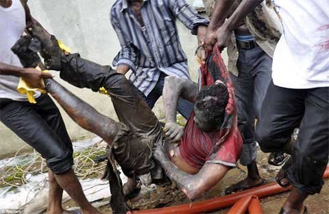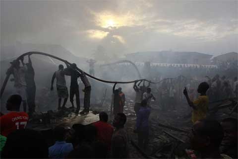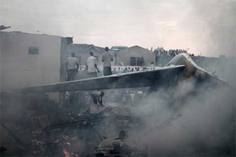 Cư dân giúp mang một vòi chữa cháy tới hiện trường vụ tại nạn của máy bay Dana Airline. Máy bay đâm vào một khu vực gồm một nhà thờ, một tòa nhà dân cư hai tầng và một cửa hiệu in ấn ỏ Lagos.