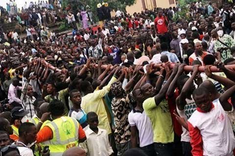 Nhiều người tập trung gần động cơ máy bay sau khi nó đâm xuống vùng ngoại ô của quận Ishaga, ngoại ô thủ đô thương mại Lagos.