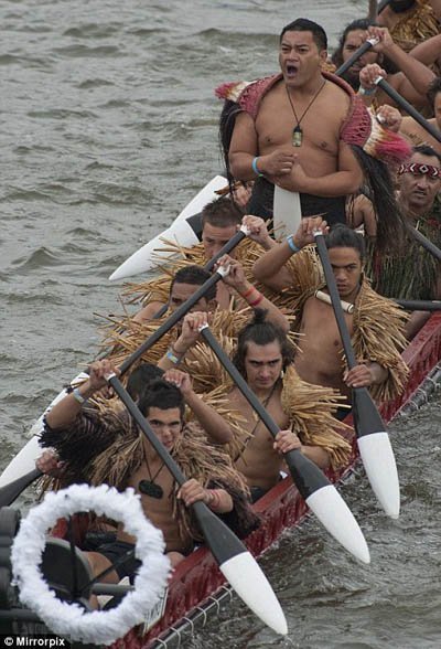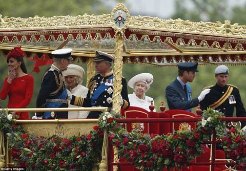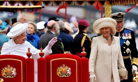 Từ trái qua phải: Công nương Catherine, Hoàng thân Philip, Công nương Camilla, Thái tử Charles, Nữ hoàng Anh, Hoàng tử William và Hoàng tử Harry trong lễ rước trên sông Thames.