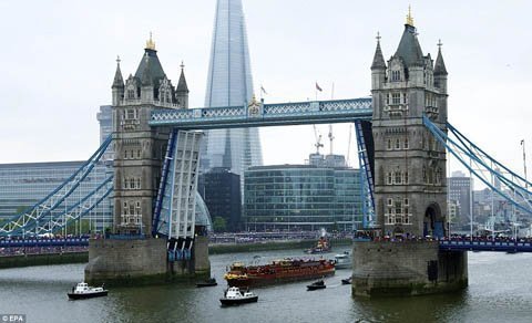 Thuyền chở gia đình hoàng gia đi qua cầu Tháp.