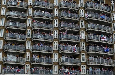 Người dân đứng quan sát từ lan can các chung cư gần sông Thames.