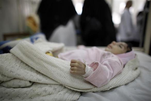 Một em bé đang được điều trị suy dinh dưỡng tại bệnh viện Sanaa.