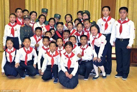 Đeo khăn quàng đỏ của Đội thiếu niên, chủ tịch Kim Jong Un nói với những đại biểu nhỏ tuổi rằng họ là chủ nhân tương lai của đất nước Triều Tiên, nơi mọi gia đình đều ngập tràn tiếng cười và sống hòa thuận.