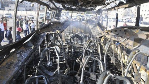 | Chiếc xe bus nát bươm sau vụ đánh bom man rợ hôm 14/6 tại Damascus, Syria. (Ảnh: Reuters) |