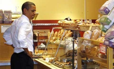 Tổng thống Mỹ tìm mua một chiếc sandwich trước khi chủ trì hội nghị bàn tròn với các lãnh đạo doanh nghiệp nhỏ tại quán bánh Grand Central ở Seattle.