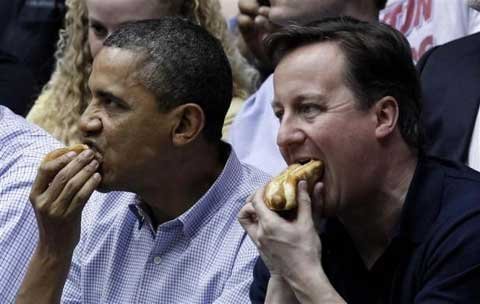 Tổng thống Mỹ và Thủ tướng Anh David Cameron ăn xúc xích khi xem vòng một giải bóng rổ NCAA tại trường đại học Dayton Arena ở Ohio