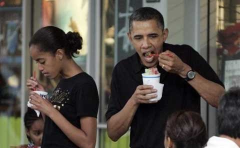 Tổng thống Obama và con gái Malia ăn kem cùng các bạn bè của gia đình bên ngoài đảo tuyết khi đi nghỉ giáng sinh tại Kailua, Hawaii.