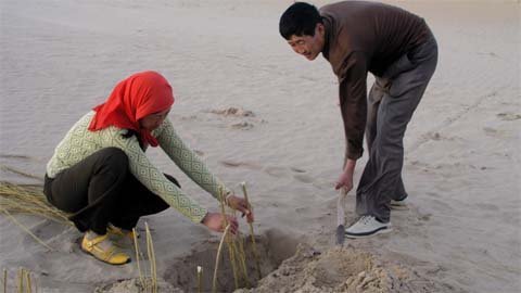Vợ chồng ông nông dân Bao Yongxin chặn cát từ đôi bàn tay trắng và công cụ thô sơ |