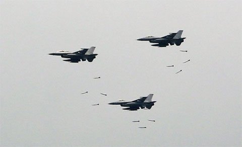 Trong bức ảnh chụp ngày 19/6, máy bay chiến đấu KF-16 của không lực Hàn Quốc thả bom trong cuộc diễn tập quân sự bắn đạn thật chung tại bãi diễn tập bắn đạn thật Seungjin tại Pocheon, Hàn Quốc, gần biên giới với Triều Tiên. Cuộc diễn tập được tiến hành nhằm chứng tỏ khả năng sẵn sàng chiến đấu trước thềm kỷ niệm 62 năm ngày chiến tranh liên Triều bùng nổ.