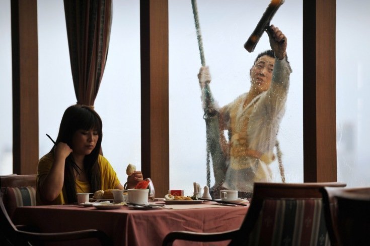 21/6, một phụ nữ đang thưởng thức bữa sáng trong khi bên ngoài cửa sổ tầng 23 khách sạn Ningbo - Trung Quốc, một người lau kính đang vất vả làm việc. Ảnh Getty