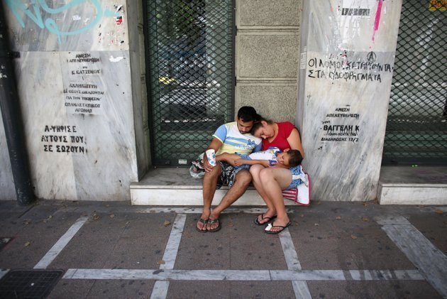 Kinh tế sụp đổ, một cặp vợ chồng ôm con xin ăn trên phố Athens, Hy Lạp. Ảnh Getty