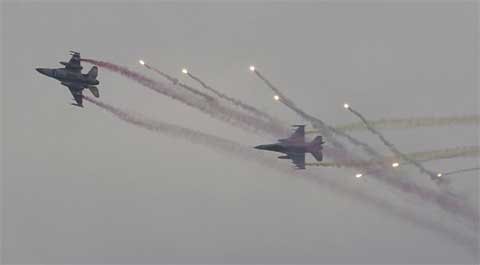 Máy bay chiến đấu KF-16 của không lực Hàn Quốc bắn đạn trong cuộc diễn tập gần biên giới Triều Tiên. Ảnh Reuters