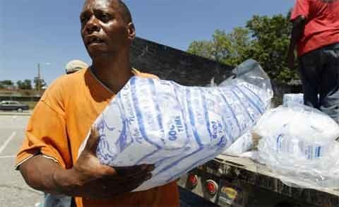 Công nhân thành phố Baltimore Joe Lane phát miễn phí các bao đá cho cư dân tại khu mua sắm Northwood Plaza