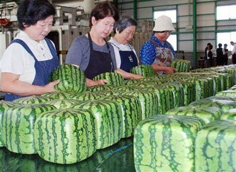 Nhưng những người nông dân Nhật Bản khéo léo đã giải quyết tình trạng khó xử này bằng cách ép những quả dưa hấu biến thành hình vuông. Người nông dân sẽ đặt những quả dưa vào những chiếc hộp kính hình vuông trong khi chúng vẫn đang phát triển.