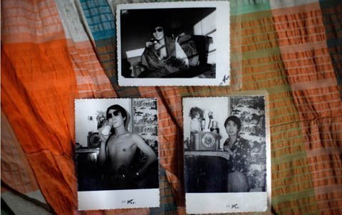Những bức ảnh cũ của Xiao Cao được dán trên bức tường của căn nhà tuềnh toàng.