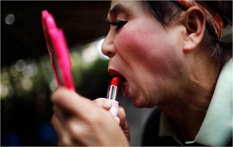 Anh trang điểm để chuẩn bị cho buổi biểu diễn ở công viên gần nhà.