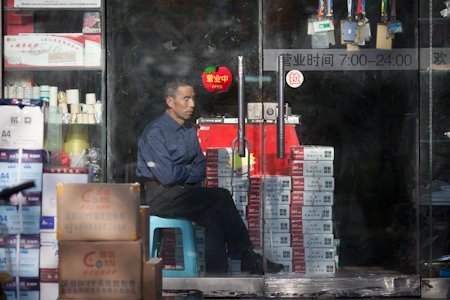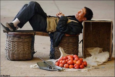 Một người bán cà chua tranh thủ ngủ gật tại khu chợ ở Changzhi, Thiểm Tây.