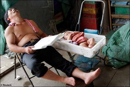 Hai cha con thi nhau ngủ tại một khu chợ ở Thượng Hải.