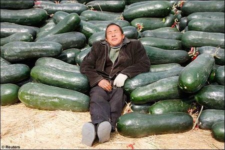 Những quả dưa khổng lồ là chỗ ngả lưng lý tưởng của người bán hoa quả tại khu chợ Huabei, An Huy này.
