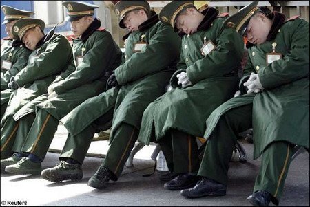 Cảnh sát ngủ gục tại một ga xe lửa ở Quảng Châu.