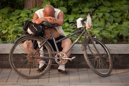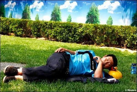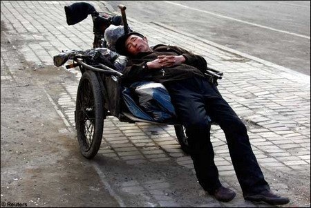 Một người lao động gục đầu lên yên chiếc xe đạp cũ kĩ của mình tại công viên ở Bắc Kinh.