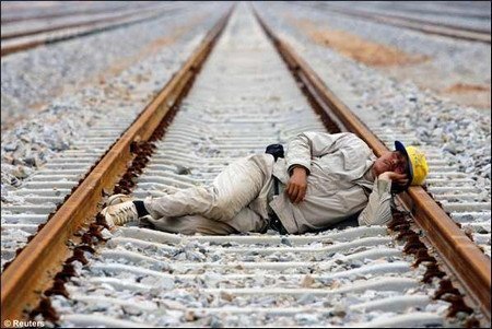 Một công nhân ngủ trên đường ray đang được hoàn thiện tại Vũ Hán, Hợp Phì.