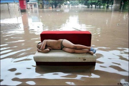 Một em bé ngủ trên chiếc ghế lênh đênh trong nước lũ tại Trùng Khánh.