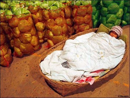 Người bán hàng ở Tứ Xuyên tận dụng chiếc giỏ đựng cải bắp làm giường ngủ.