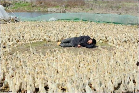 Một người đàn ông ngủ ngon lành bên đàn vịt của mình tại một trang trại ở Jiaxing, Chiết Giang.