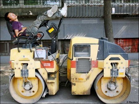Người lái xe chợp mắt trên chiếc xe lu gần công trường xây dựng ở Bắc Kinh.